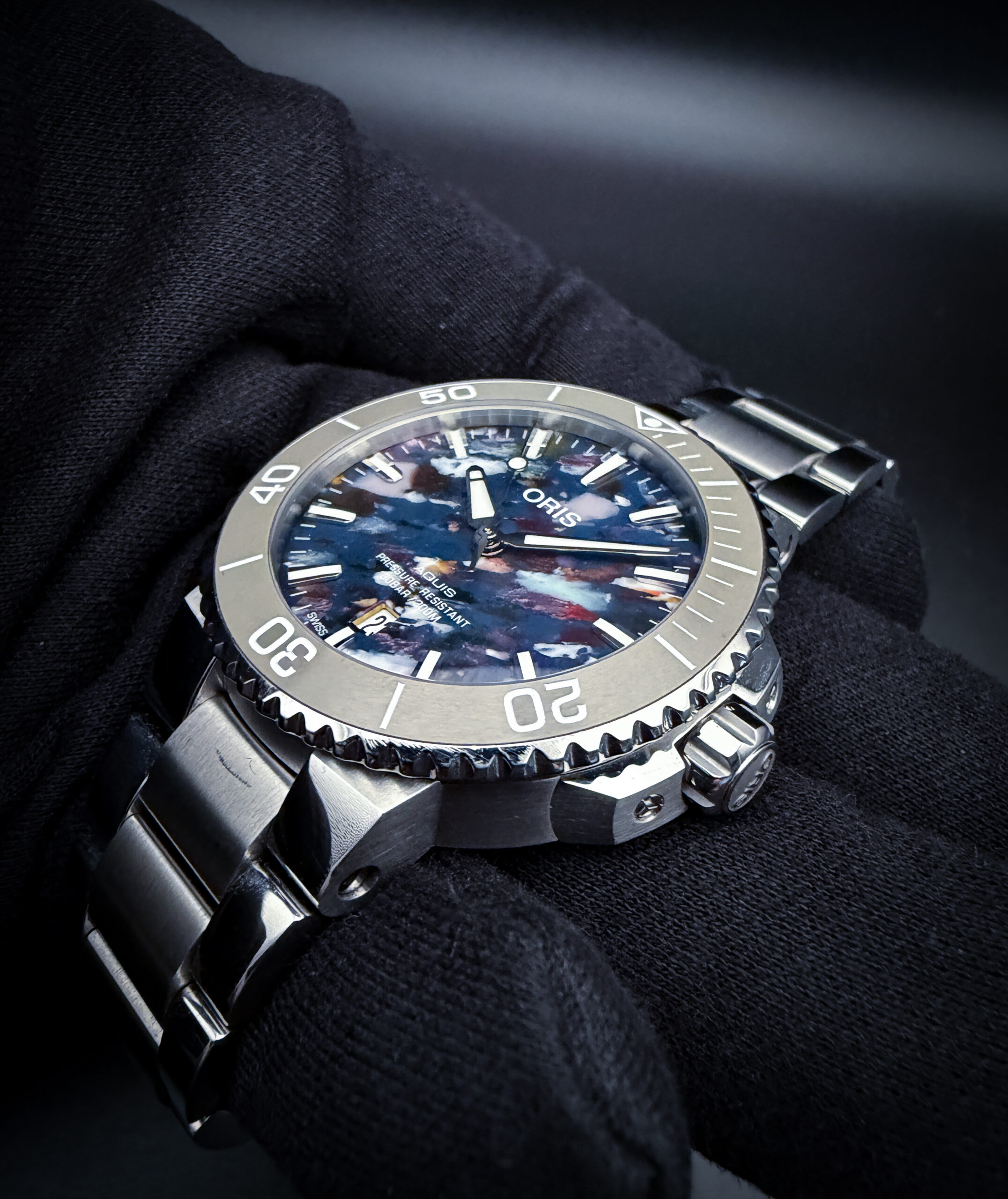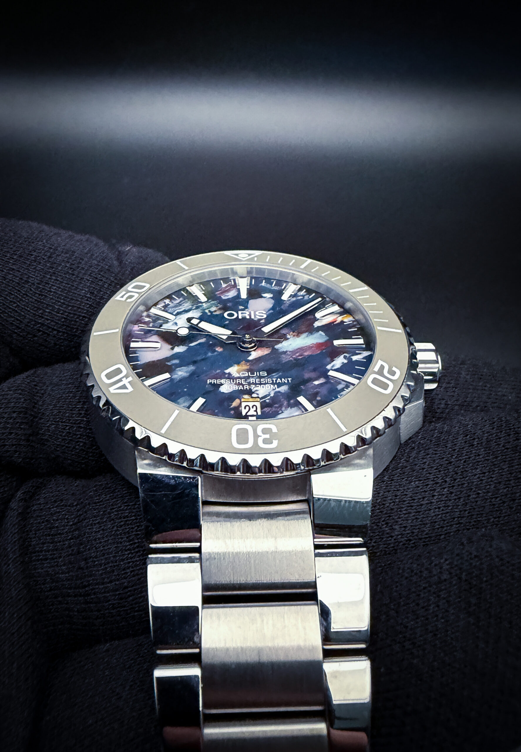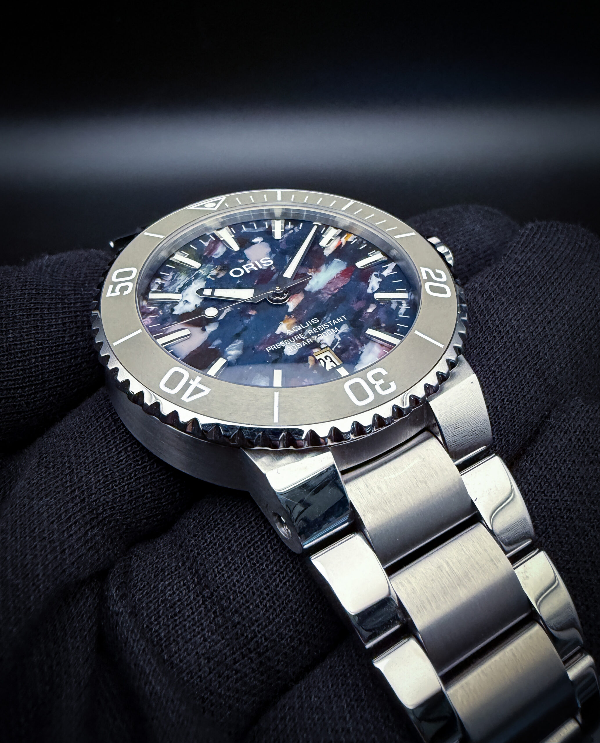Offered here is the Oris Aquis Date “Upcycle” reference 01 733 7766 4150, a distinctive modern dive watch known for its sustainability-focused design and one-of-a-kind dial. Each “Upcycle” dial is crafted from recycled ocean plastic, resulting in a unique multicolor pattern—no two dials are exactly alike—while still maintaining excellent legibility with applied indices and a date display at 6 o’clock. The stainless steel case measures approximately 41.5mm and is paired with a unidirectional rotating bezel, making it equally suited for daily wear or active use.