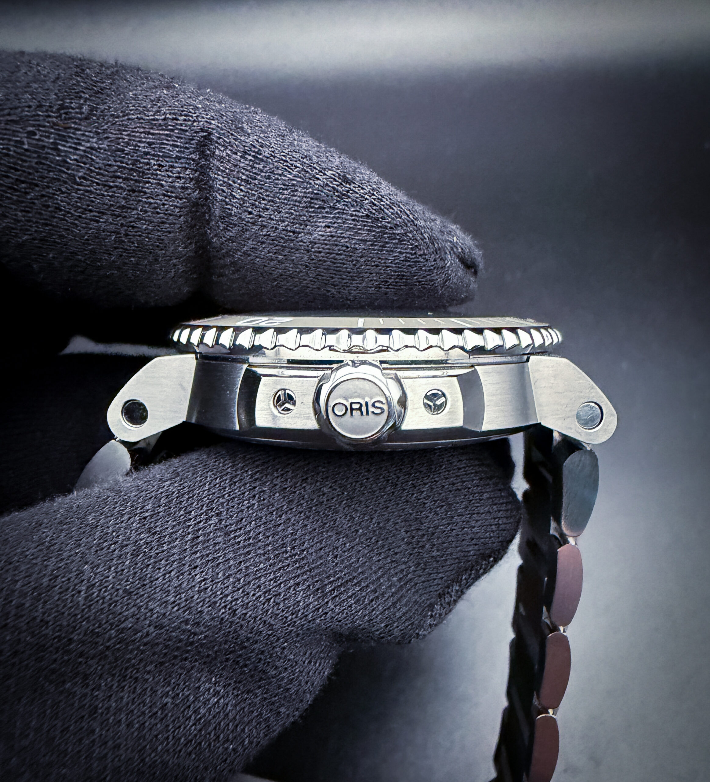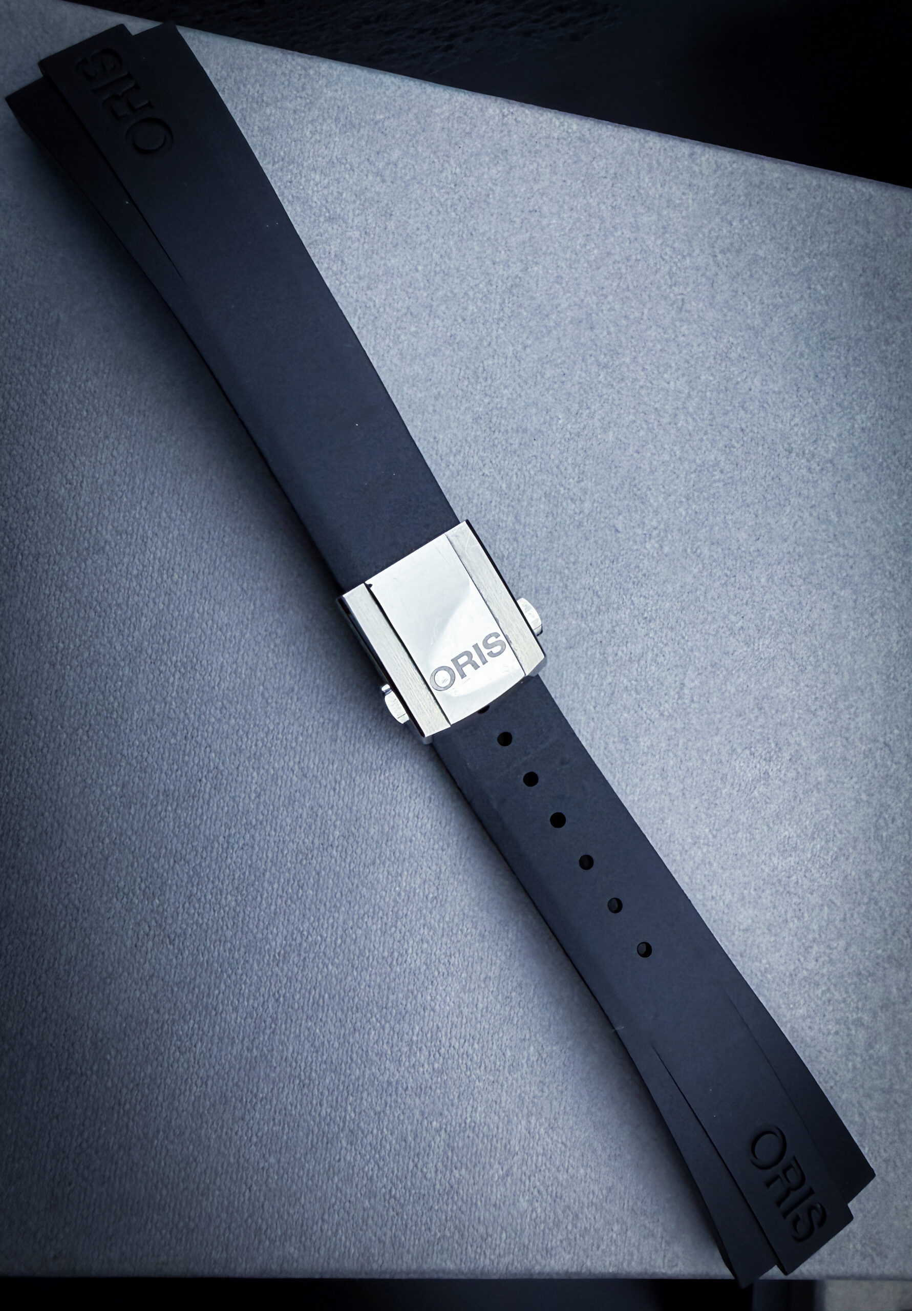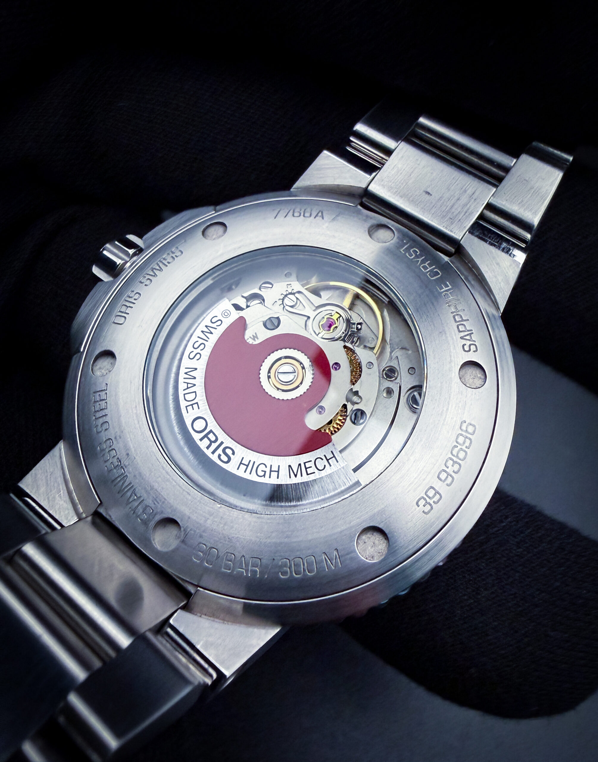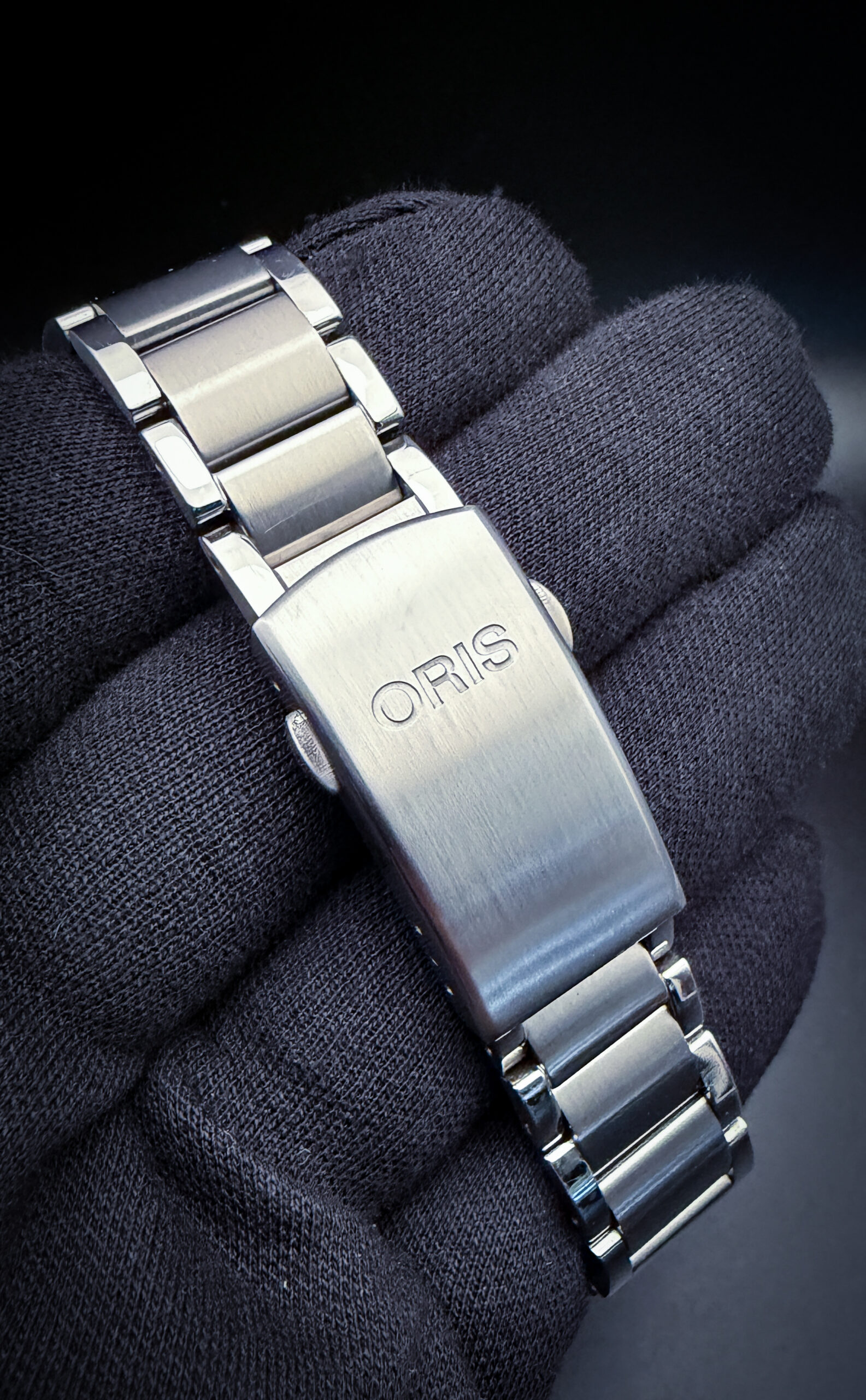 This example is offered as a complete set, including the original outer box, inner case, hang-tag, instruction booklet, warranty card, and an additional Oris rubber strap. The watch is currently fitted on the original stainless steel bracelet, sized to fit approximately a 7.25-inch wrist, with three (3) additional links included in the box for further adjustment.