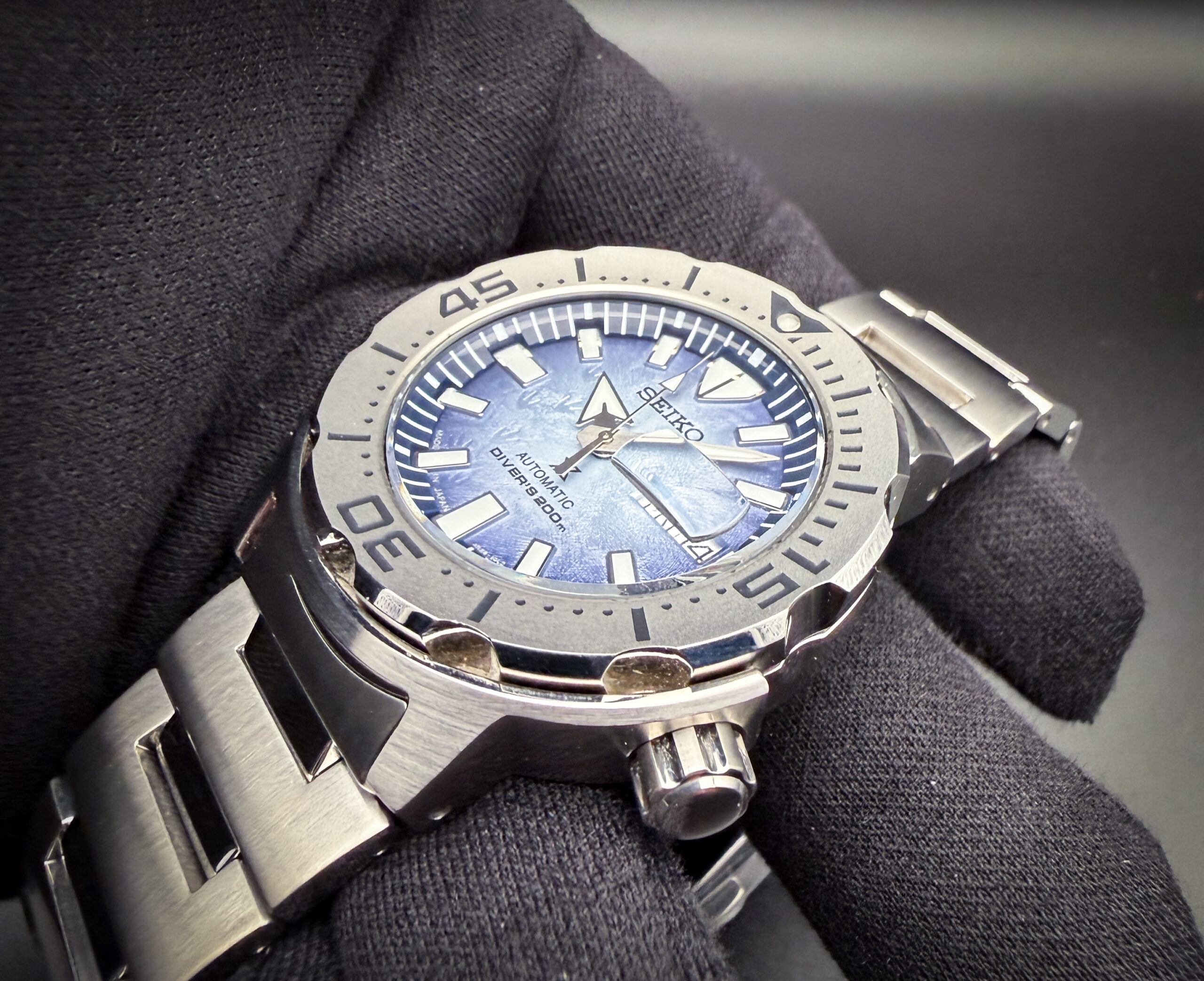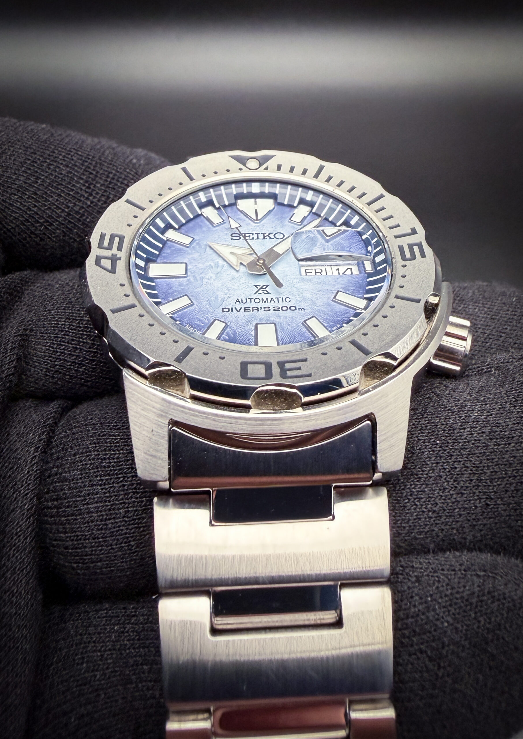 Seiko Save the Ocean Prospex Monster “Penguin Feet” SRPG57 in a 42mm stainless steel case, powered by the Seiko 4R36 automatic movement. This Seiko has been tested in excellent working order and is ready for wear or to be added to a collection. Includes the original Seiko hang-tag and a Crown & Caliber travel case.