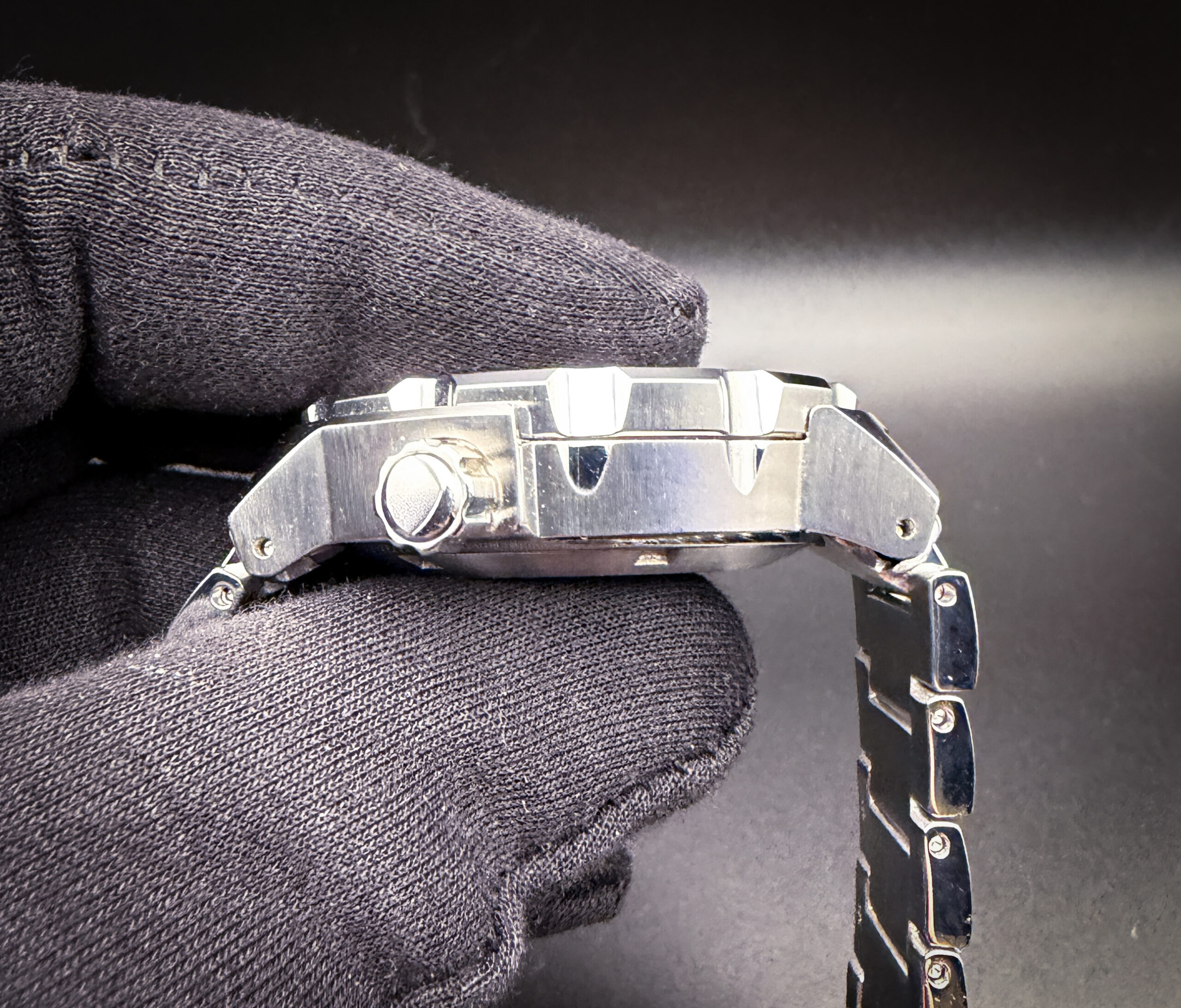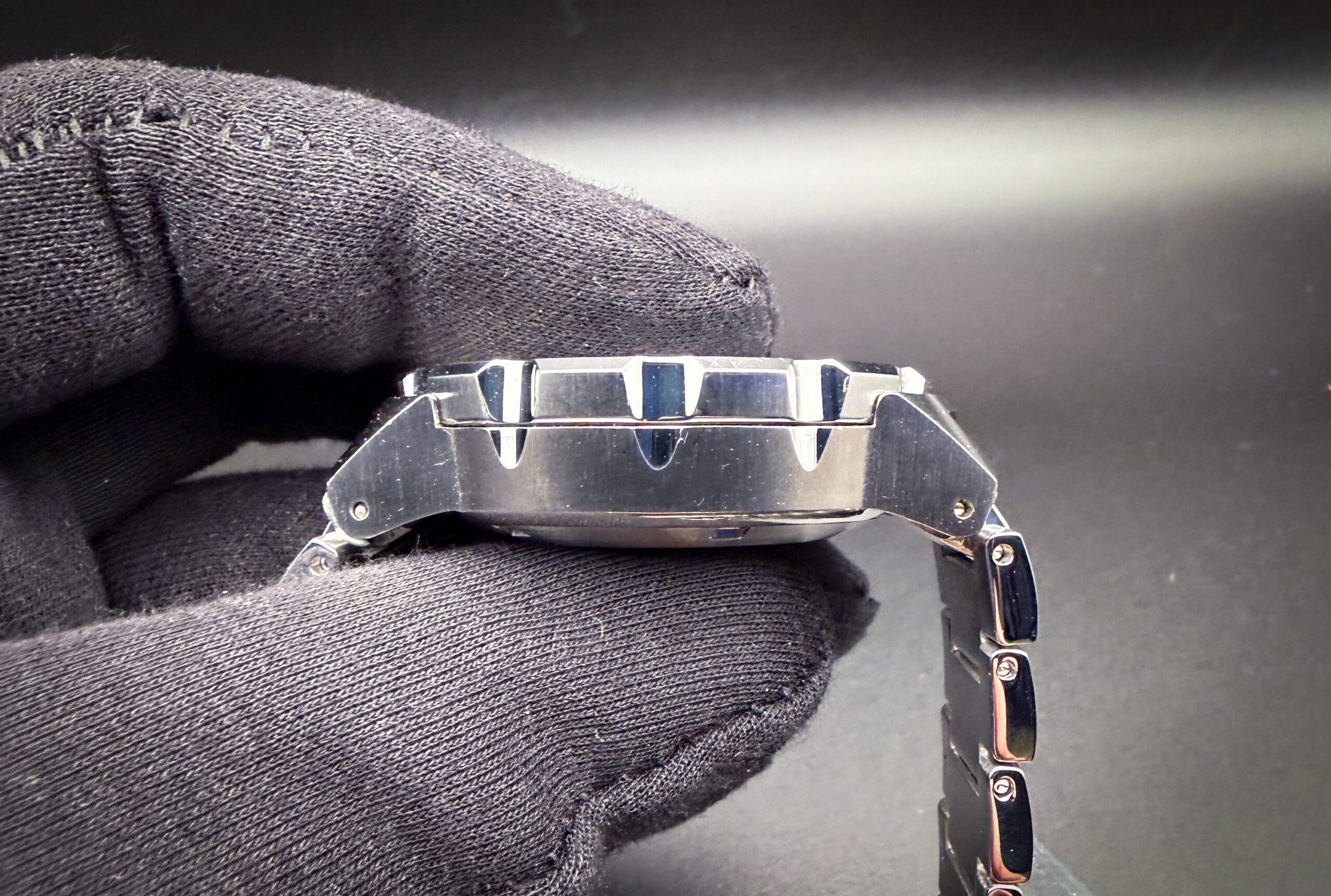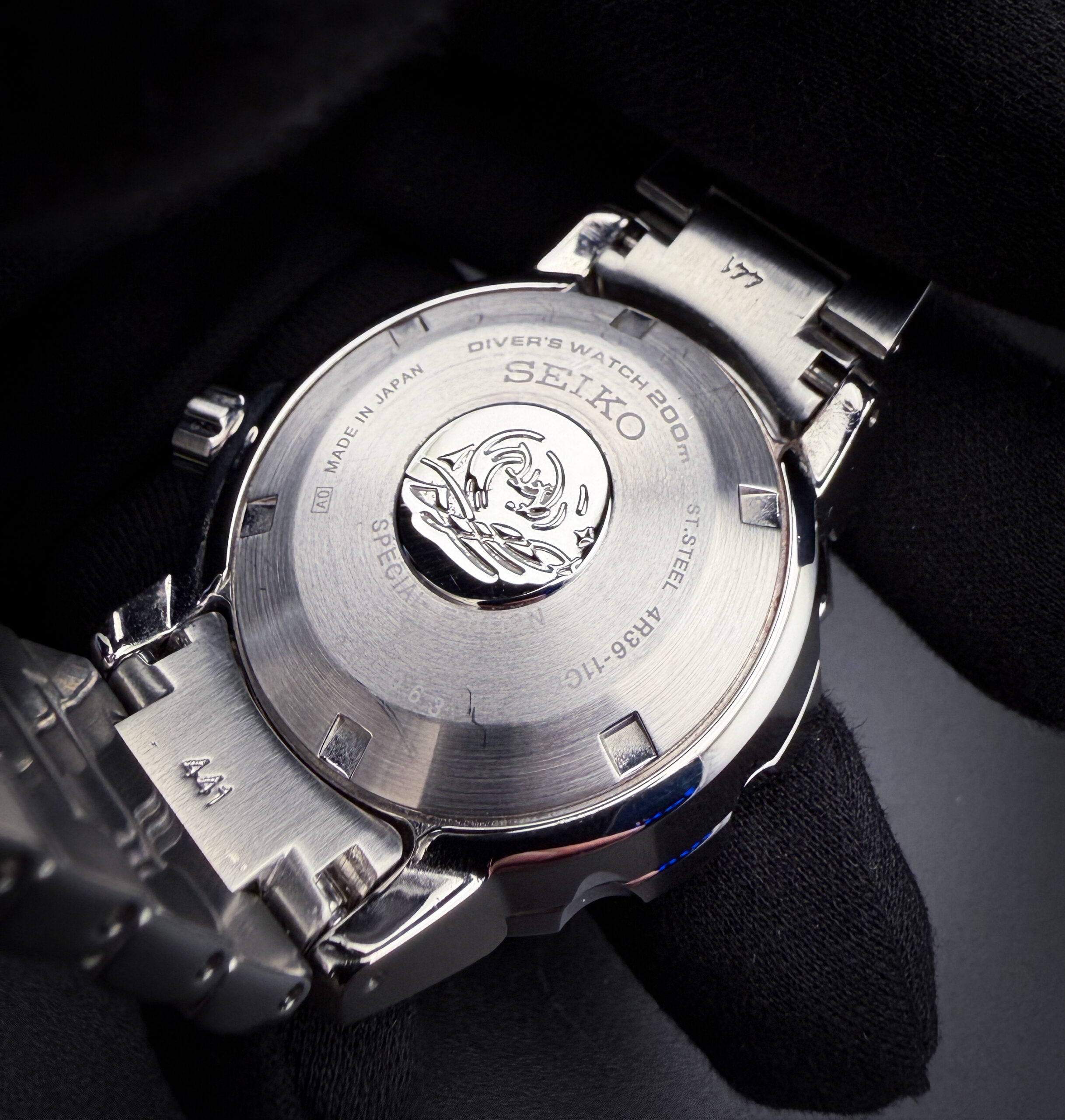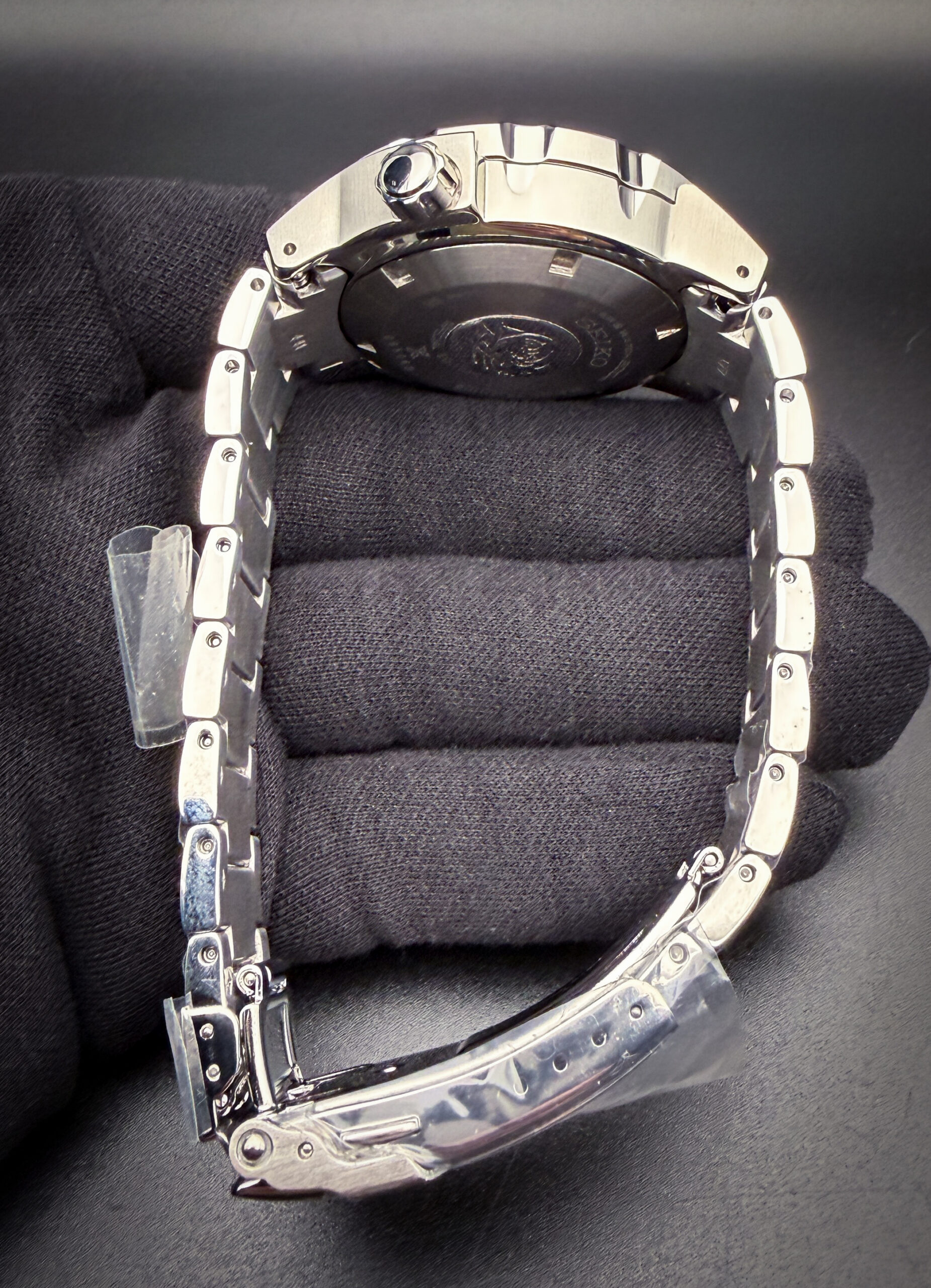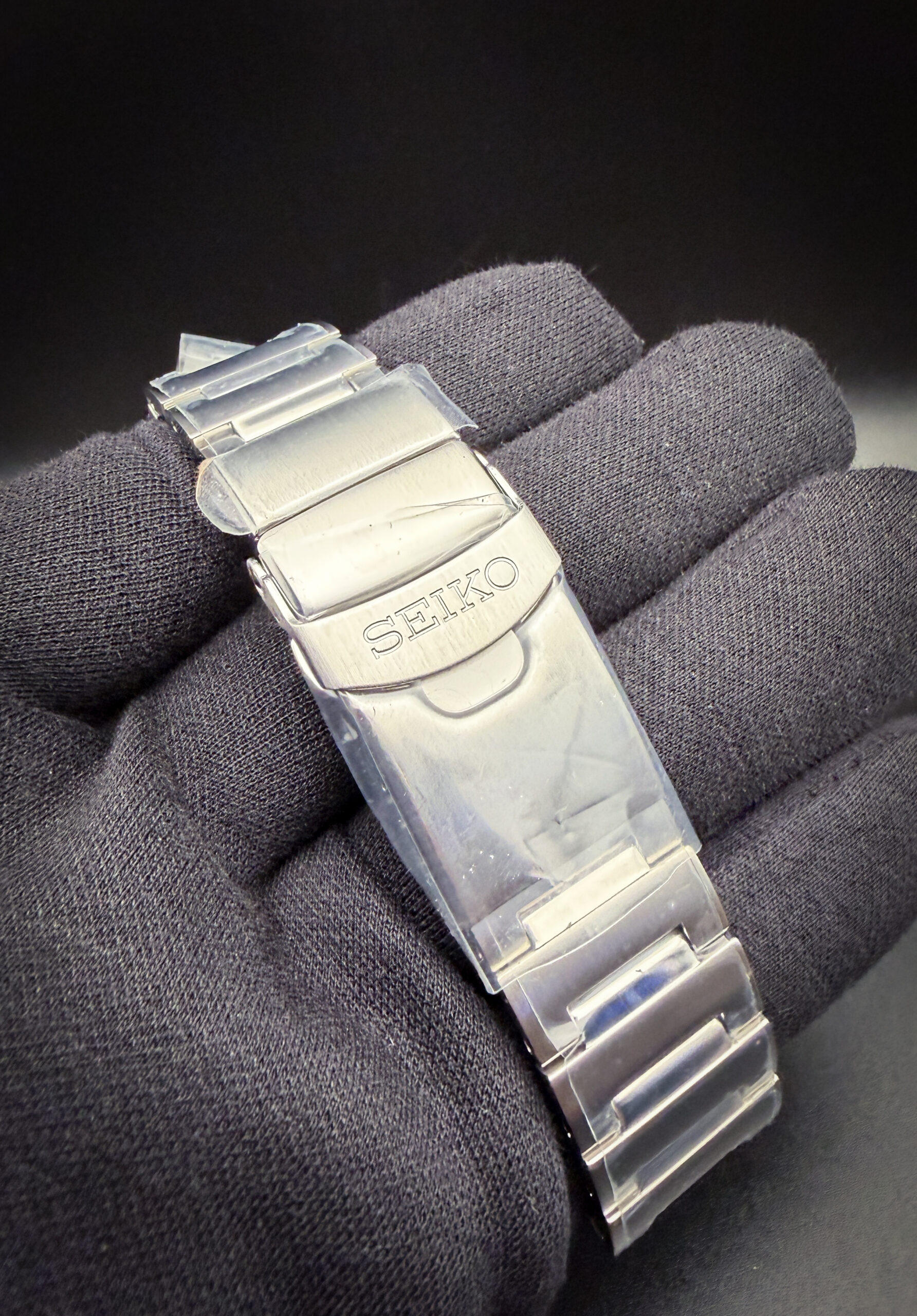 This Seiko is paired with the original, unworn, full-linked bracelet with the protective plastic still applied.