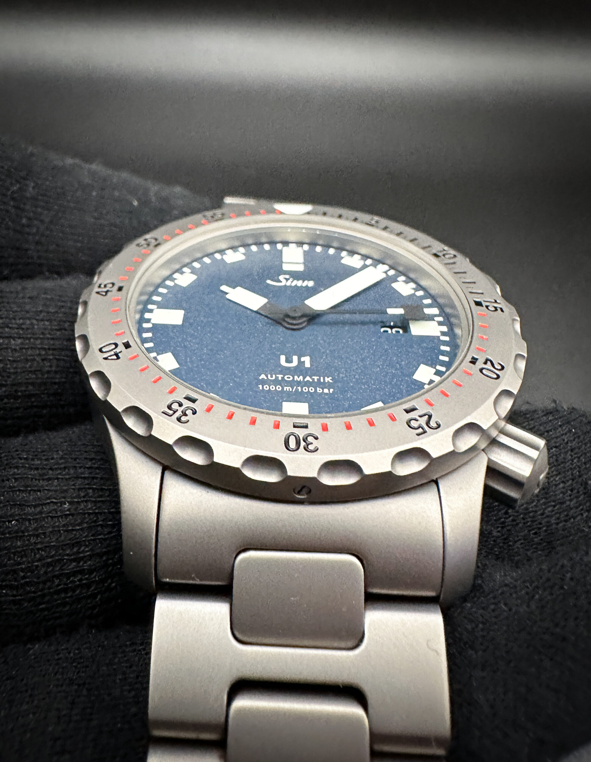 The Sinn U1 is a robust German diving watch known for its case made from high-strength German submarine steel, which is highly resistant to seawater and corrosion. It is water-resistant to 1,000 meters (100 bar) and certified to European diving standards. Key features include a 44mm case, a high-contrast dial, and a crown positioned at the 4 o’clock position to avoid pressure on the back of the hand.