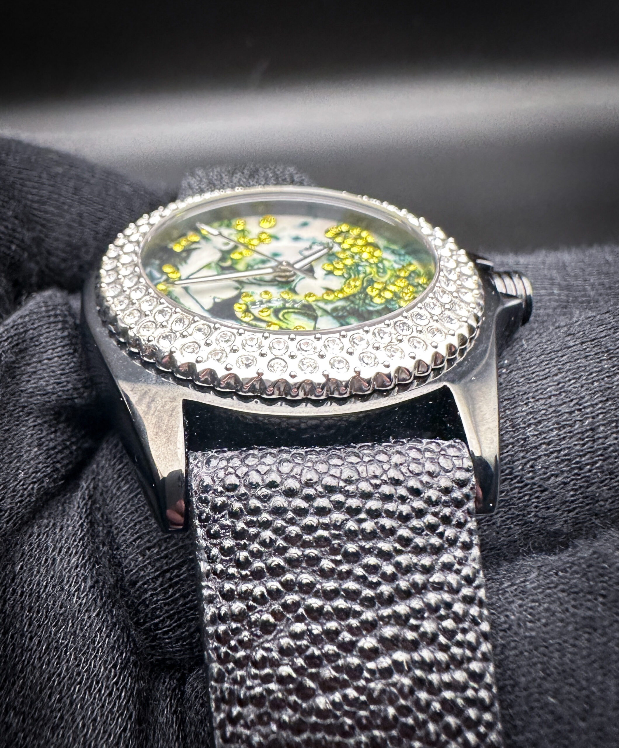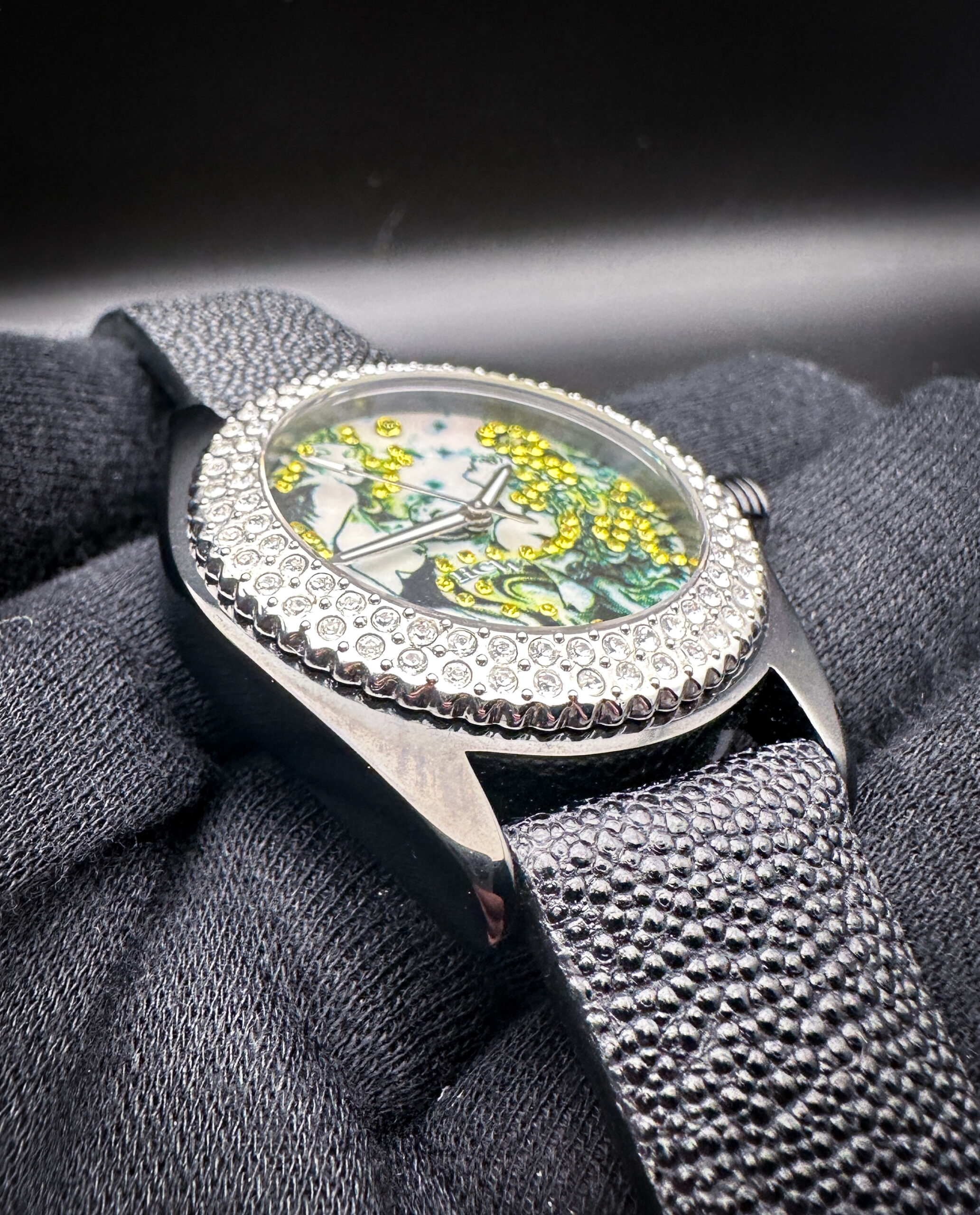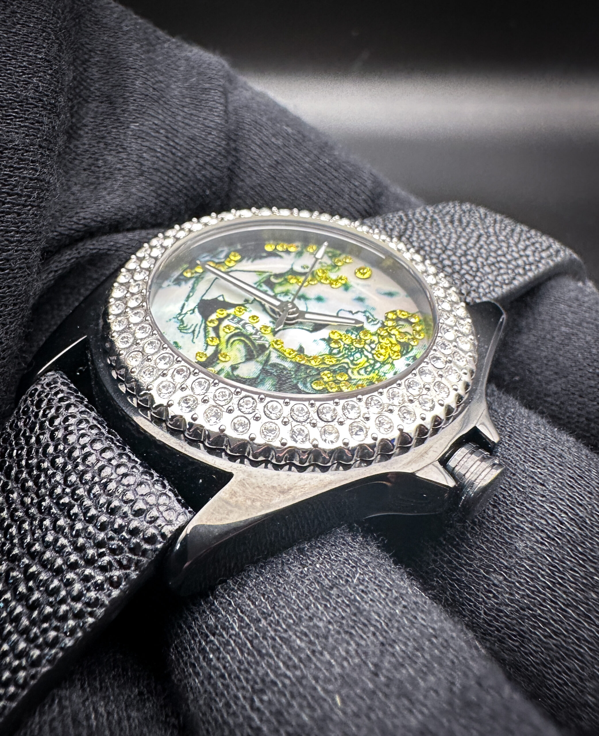 Sisters of Darkness is crafted in a perfectly machined case finished in ebony black IP. The dial work is created in white mother of pearl with authentic Swarovski crystals individually in the hair and painted artwork. The bezel is accented with brilliant white Swarovski crystals. Two hand made stingray straps accompany each Black Widow timepiece and interchange easily with our custom quick release mechanism. Each steel case back is etched with the artwork. Only 500 editions are offered world wide.