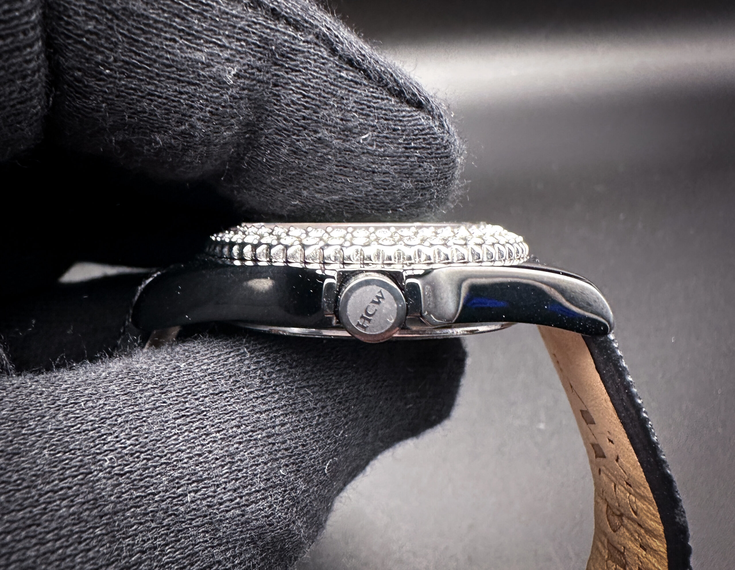 Like-New Steve Soffa Hardcore Watch Company “Sisters of Darkness” ART713, limited edition #120/500, in a 38mm black stainless steel case, featuring a unique mother of pearl dial. This watch includes: Outer box, inner case, booklet, instruction manual, certificate of authenticity, key-chain, and two Stingray two-piece straps.