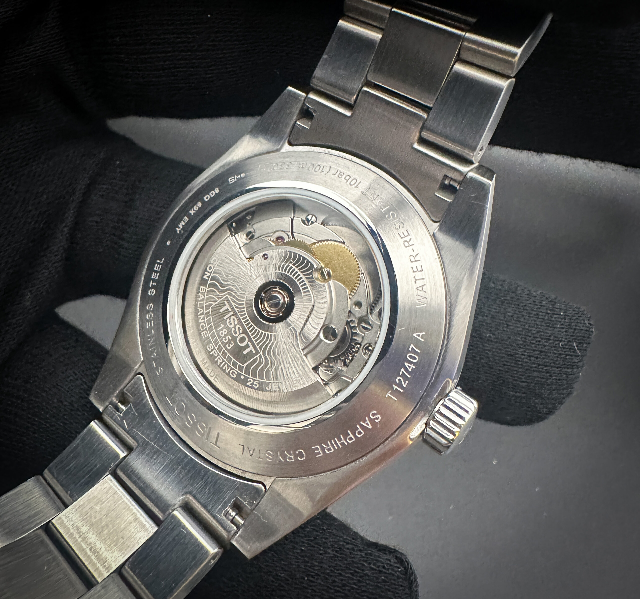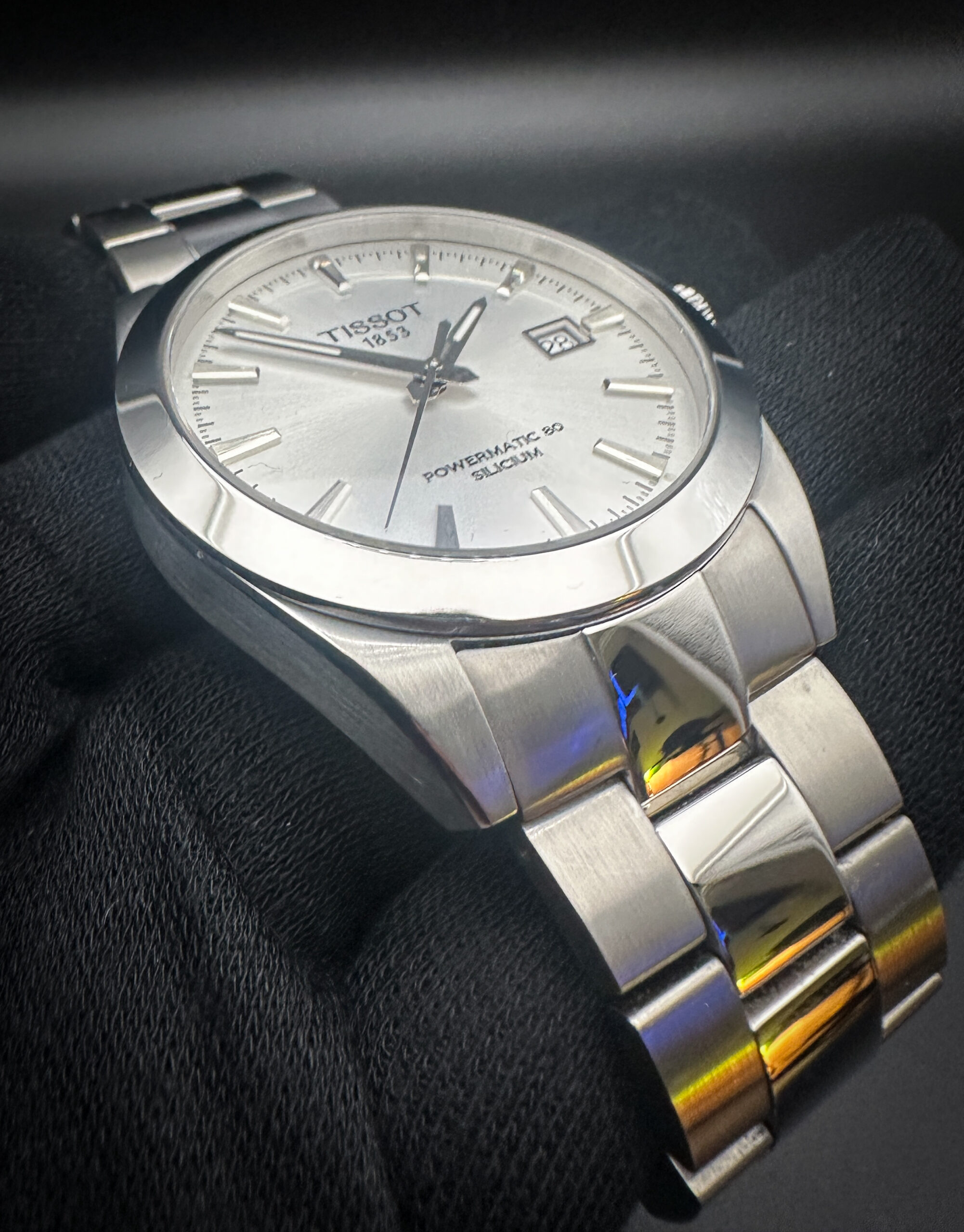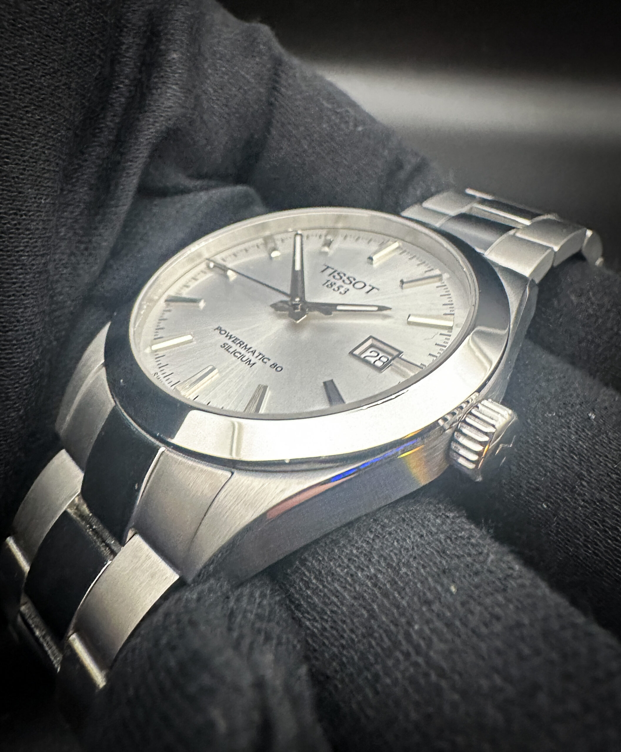 The Tissot T127.407.11.031.00 is a 40mm men’s automatic watch from the Gentleman collection, featuring a silver dial, a stainless steel case and bracelet, and a Powermatic 80 movement with an 80-hour power reserve. It is water-resistant to 100 meters and has a domed, scratch-resistant sapphire crystal with an anti-reflective coating. The watch is also known for its versatility and everyday wearability.